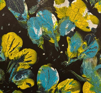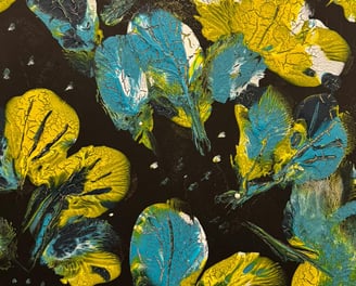 Cette œuvre évoque un univers à la fois énigmatique et captivant. Les formes colorées aux teintes de bleu, vert et jaune semblent flotter dans un espace sombre, rappelant des feuilles, des pétales ou des fragments d’une nature abstraite illuminée par une lumière douce. Chaque élément paraît suspendu, comme figé dans un instant hors du temps, créant un contraste saisissant avec le fond noir. Le jeu de textures et de craquelures renforce cette impression d’une matière organique ou d’un phénomène naturel observé de très près, comme une scène intime dévoilée sous une lumière mystérieuse. Le tableau invite à l’exploration, comme si l’on observait un microcosme caché.